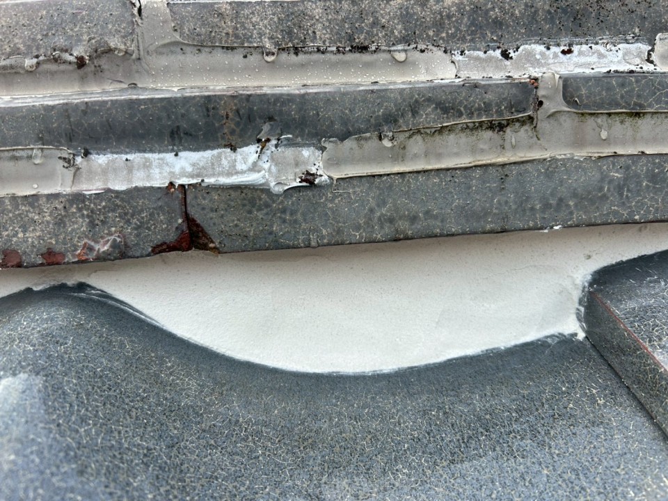 棟下の面戸漆喰の黒ずみや部分的に剥がれている箇所が