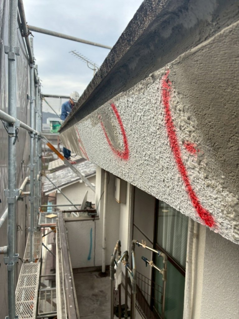 軒や軒裏、外壁の補修の箇所をマーキングして順番に補修します。