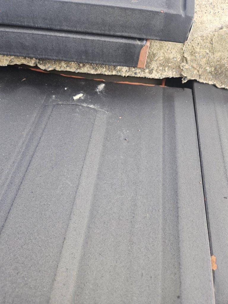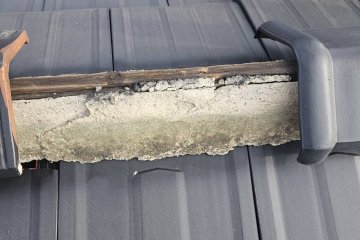 地震や漆喰の剥がれにより、棟瓦と平瓦の間に隙間が見られます。