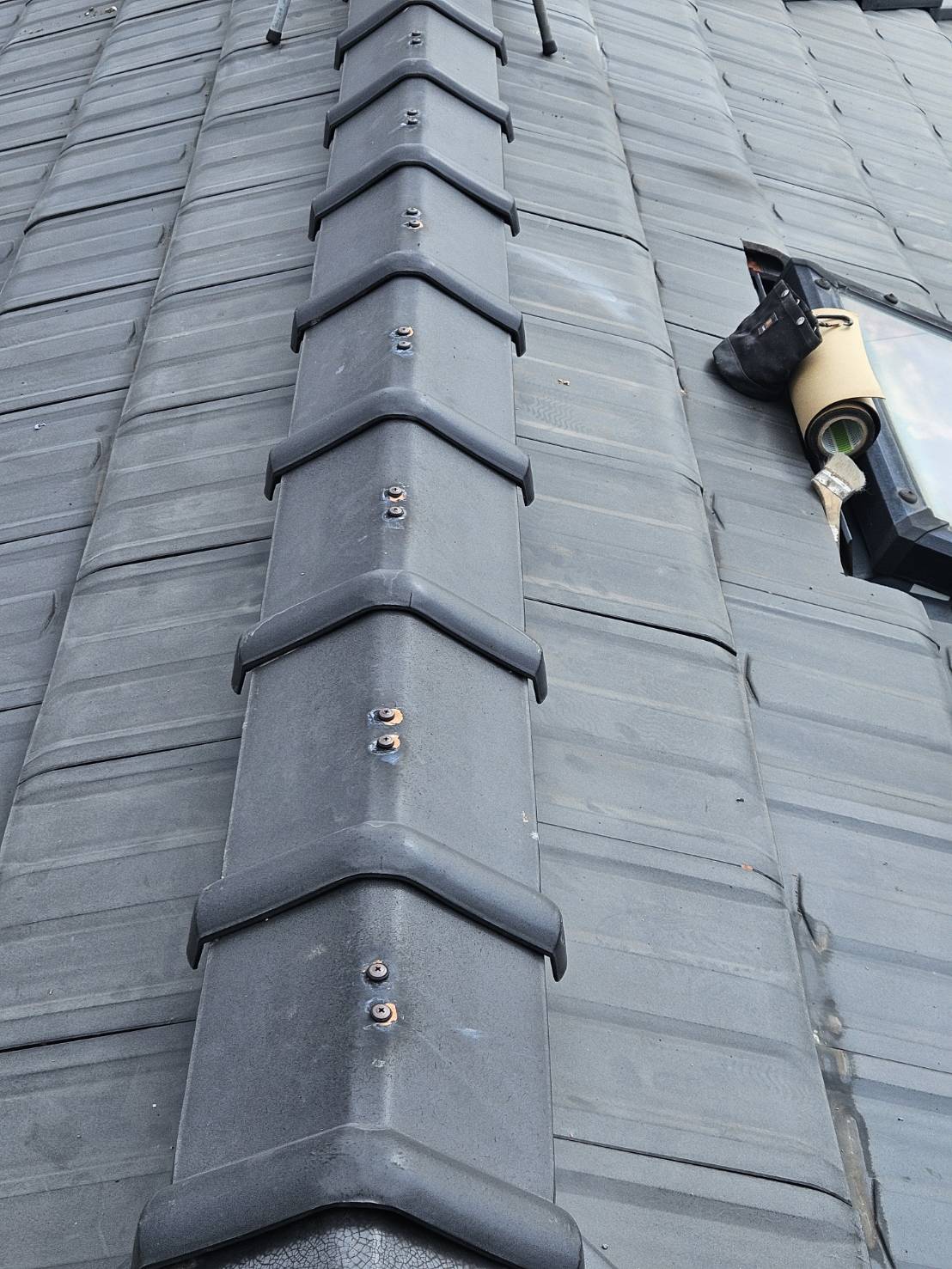 最後に外した棟瓦を合わせて、中の樹脂垂木に向けてステンレススクリュービスで揉んだら完成です!